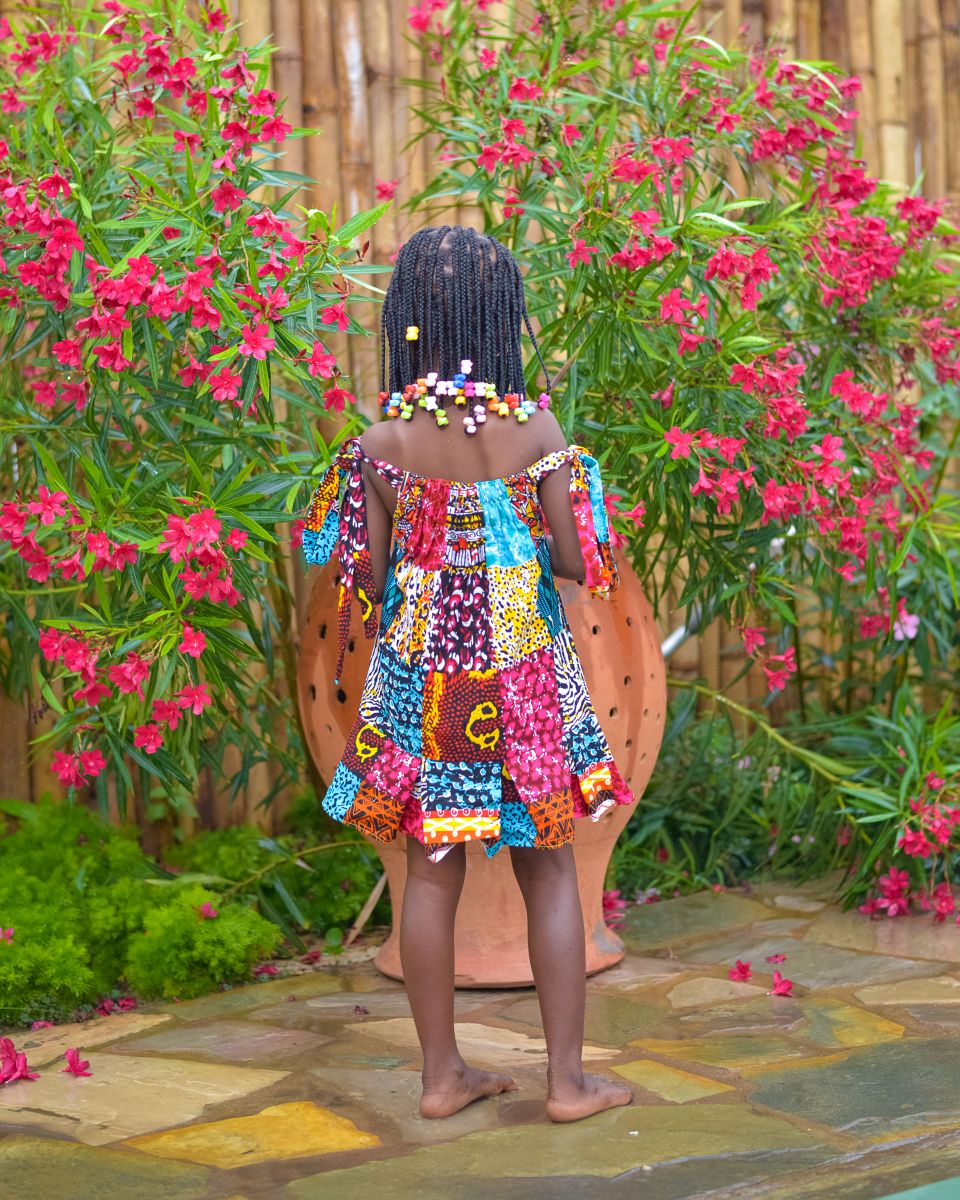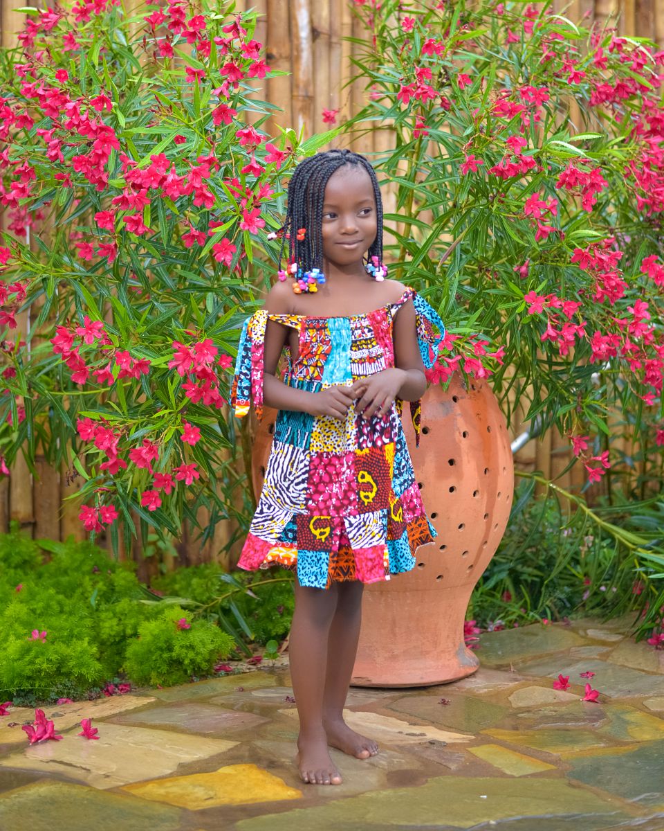 Cette magnifique robe pour fille est confectionnée dans un tissu wax africain multicolore aux motifs variés et éclatants. Son design à épaules dégagées et ses manches nouées apportent une touche moderne et élégante, tout en mettant en valeur l’authenticité du style africain.
